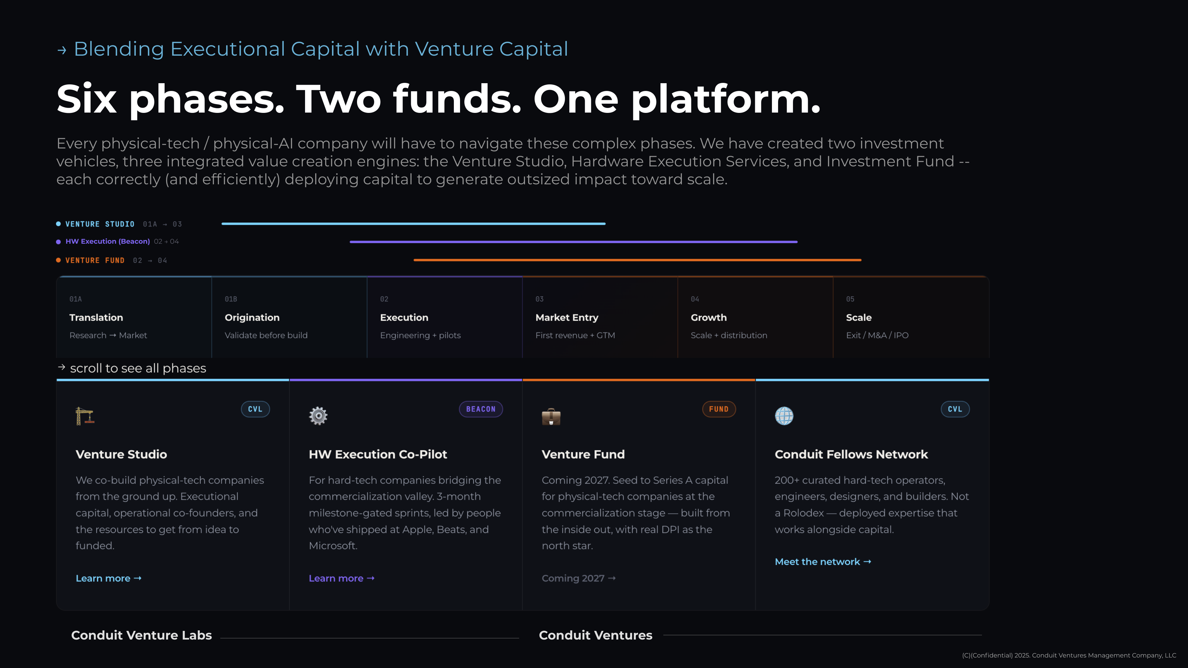 The platform maps directly to how physical-tech companies actually mature - across three distinct phases, each demanding different leadership, capital structures, and partnership configurations: