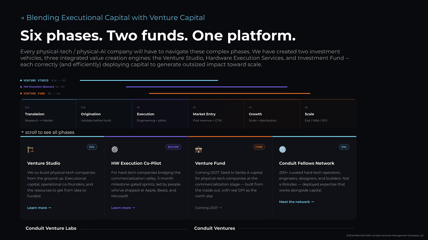 This is the nature of value creation across physical-tech: orchestrated, phased, and deeply relational. Conduit’s role is to serve as the connective tissue across these phases, ensuring the right teams, capital, and strategic relationships are in place before they are urgently needed.